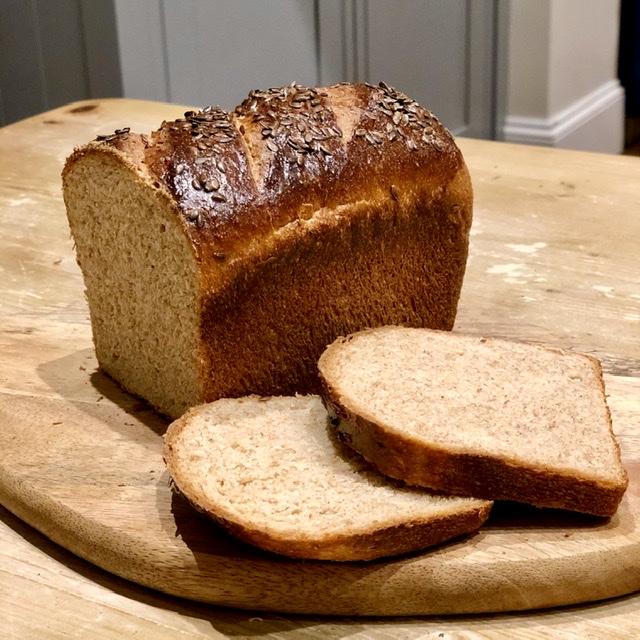 Made with a blend of wholemeal and white wheat flour and enriched with honey, butter and milk, this loaf has a soft crumb and a chewy crust. Absolutely delicious!